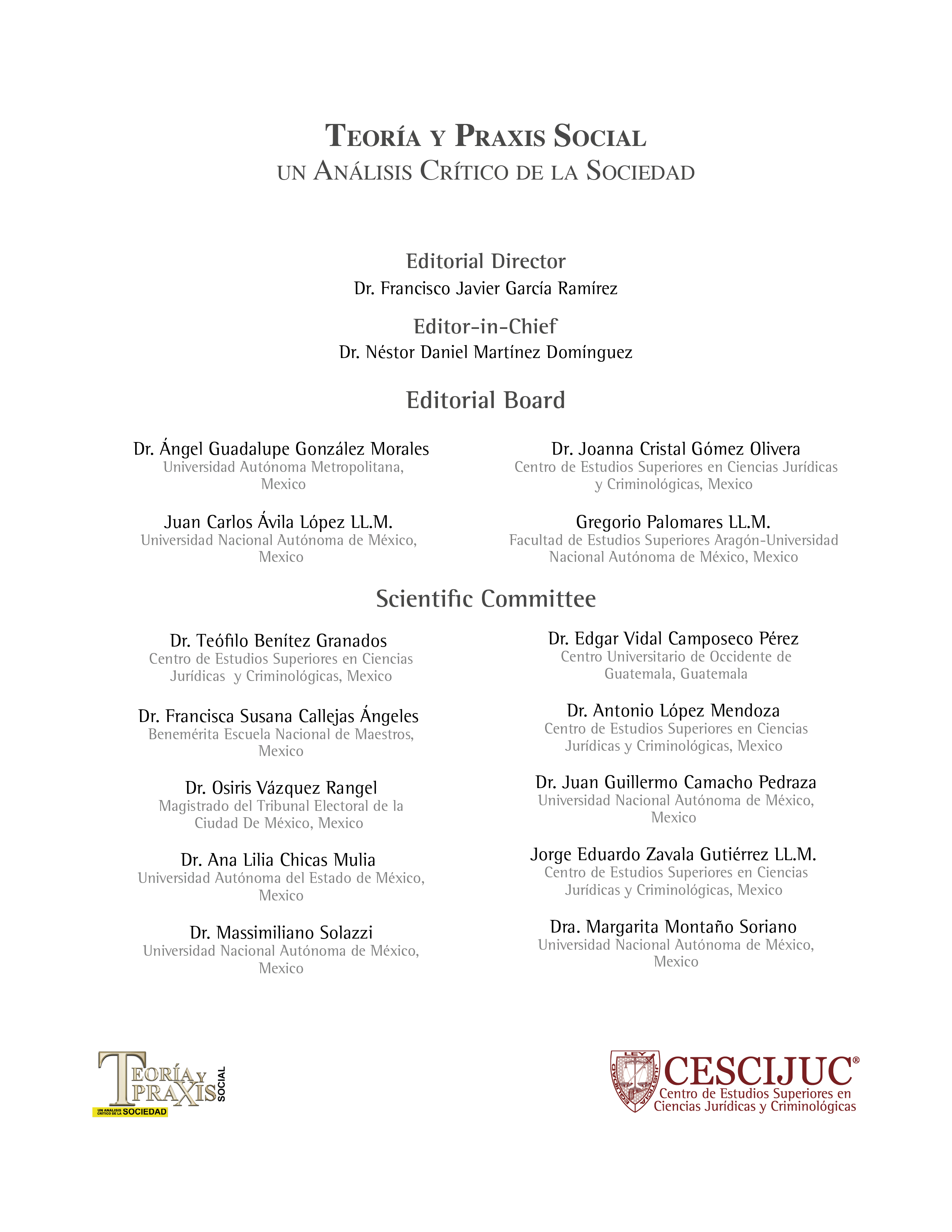 TEORÍA Y PRAXIS SOCIAL UN ANÁLISIS CRÍTICO DE LA SOCIEDAD, vol. 1, núm. 1, 2026, es una publicación semestral editada por el Centro de Estudios Superiores en Ciencias Jurídicas y Criminológicas, Balderas 138, Col. Centro, Delegación Cuauhtémoc, CP. 06070, Ciudad de México, Tel. 55 55059348, https://revista.cescijuc.edu.mx/files, investigacion.nacional@cescijuc.edu.mx, Editor responsable: Néstor Daniel Martínez Domínguez, Reserva de Derechos al Uso Exclusivo No. 04-2025-012313101500-102, ISSN: en trámite, ambos otorgados por el Instituto Nacional de Derechos de Autor. Responsable de la última actualización de este Número, Néstor Daniel Martínez Domínguez, Balderas 138, Col. Centro, Delegación Cuauhtémoc, CP. 06070, Ciudad de México, fecha de última modificación, 15 de enero de 2026.